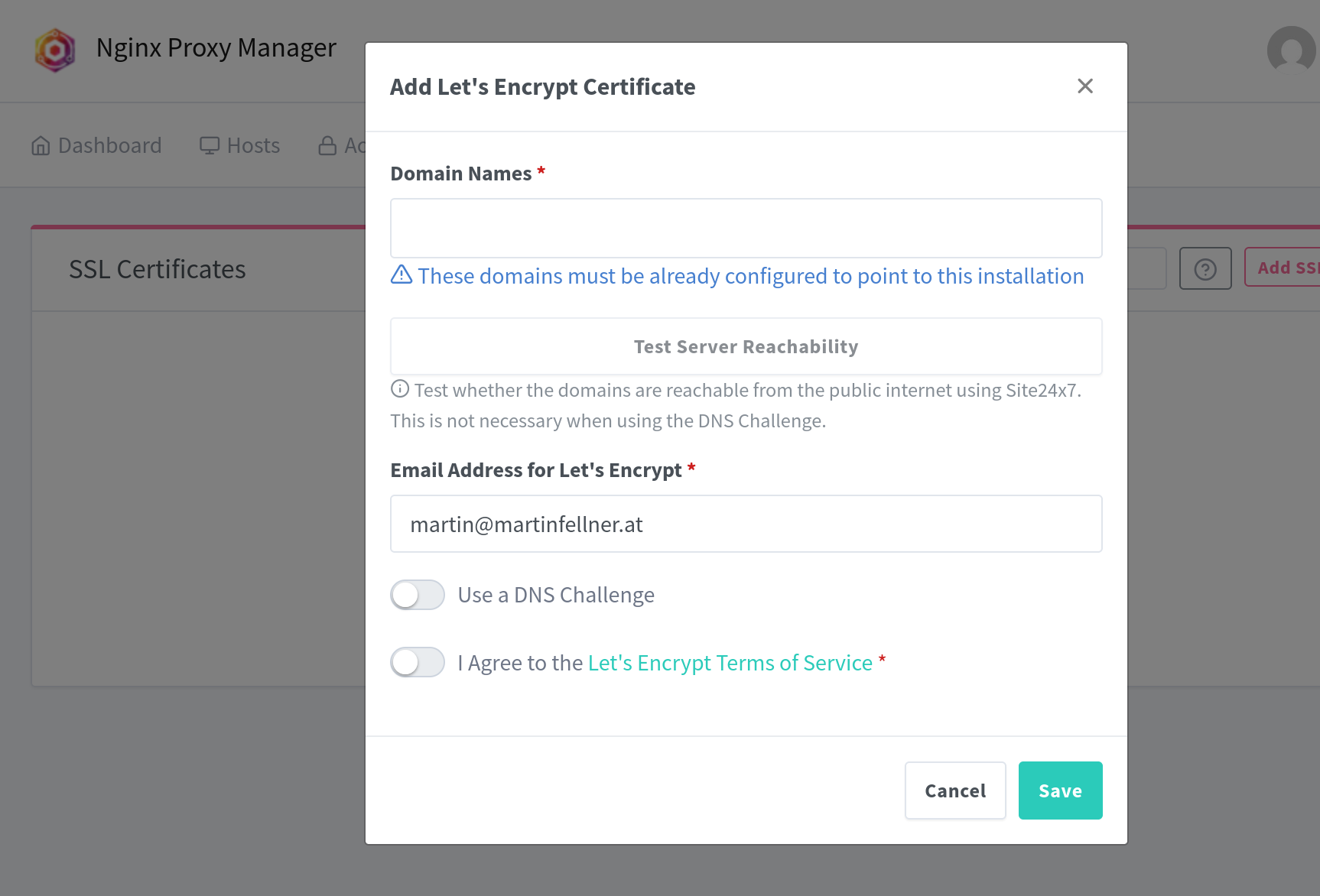 Einen guten Überblick bietet dieser Beitrag, aber statt DuckDNS verbinden wir uns direkt mit dem API-Zugang vom Hostinganbieter. Bei mir ist das Netcup und da ist es wichtig, dass man bei der SSL-Zertifikatserstellung 900 Sekunden Wartezeit eingibt, denn mit der Standardzeit geht es sich nicht aus und NPM spuckt dann nur Fehler aus.