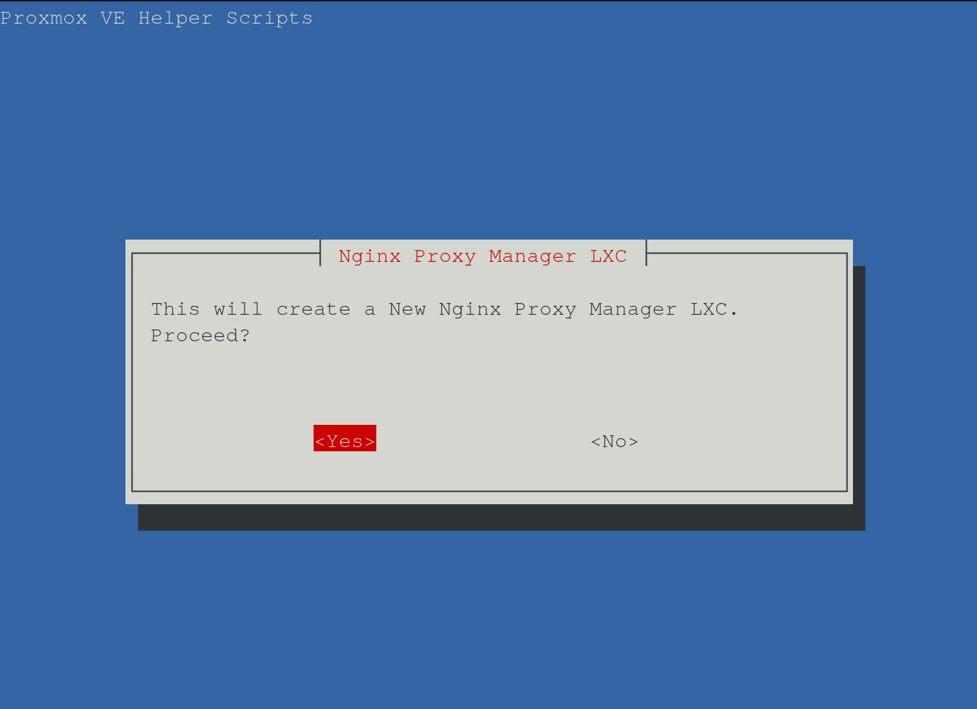 bash -c "$(curl -fsSL https://raw.githubusercontent.com/community-scripts/ProxmoxVE/main/ct/nginxproxymanager.sh)"