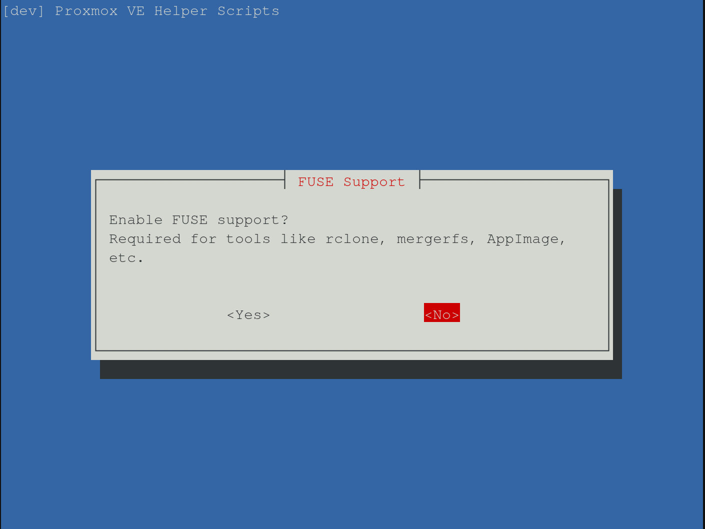 Für den Nginx Proxy Manager braucht man keine FUSE-Unterstützung, kann man also auf nein lassen: