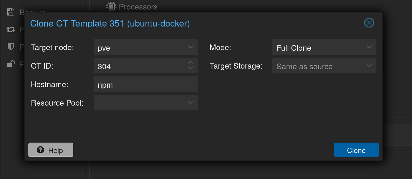 Dafür klone ich mein Docker-LXC-Template: