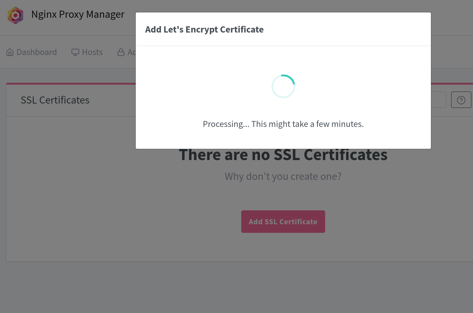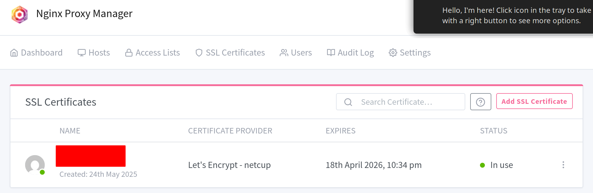 Nach etwa einiger Wartezeit (bei Netcup sind 900 Sekunden) erscheint das erfolgreiche Zertifikat in NPM: