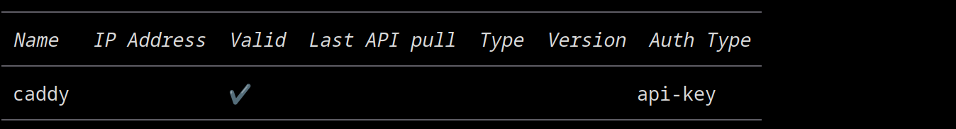cscli bouncers add caddy… den Caddy-Bouncer auf dem Crowdsec-Server hinzufügen.