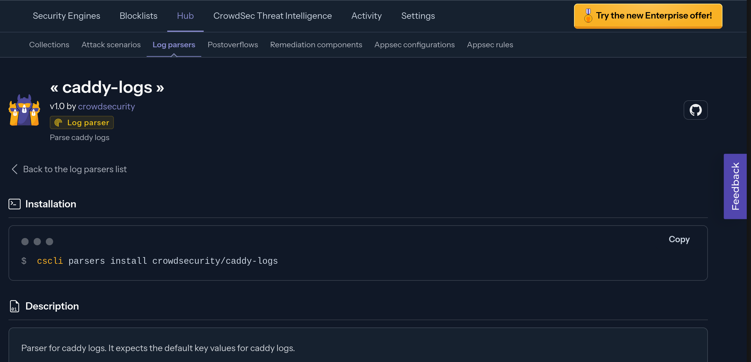 In der Crowdsec-Weboberfläche kann man Log-Parser installieren, wie zb für Caddy: