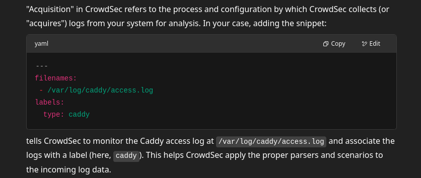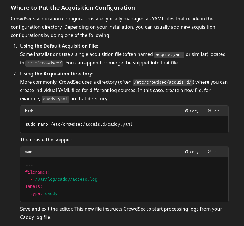 site: martinfellner.atNotabene: die drei Striche --- unterteilen in yaml zwei separate yaml-Einträge in einem Dokument. Nachdem wir hier aber eh eine Konfig pro Log machen, ist das egal. Den type nicht angreifen, ich habe zuerst dort die Domain hinzugefügt (type: caddy-martinfellner-at und das hat überhaupt nicht funktioniert, da crowdsec die Art des Logs mit dieser Bezeichnung bestimmt).