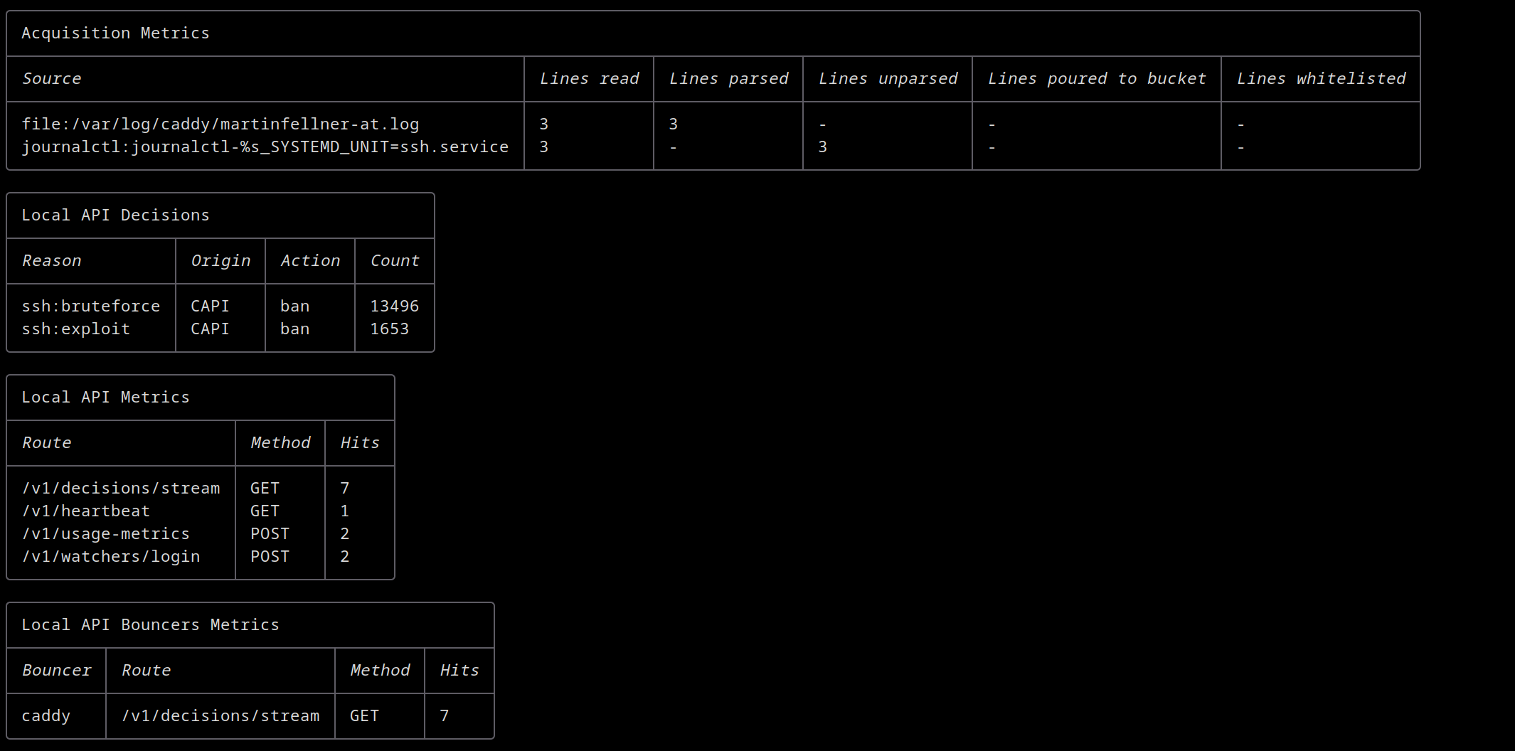 Und mit sudo systemctl restart crowdsec den Dienst neustarten und sobald Aufrufe auf die Seit kommen scheint das Log auch unter cscli metrics auf: